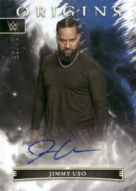 The Jimmy Uso 2023 Chronicles WWE #OA-JMY Origins Autographs - Holo Silver /25 card is 1 of 64 Jimmy Uso's card variations in the 2023 Chronicles WWE set being tracked by Sports Card Investor, including #208 Base, #140 Base, #27 Base, #280 Base, and #332 Base.