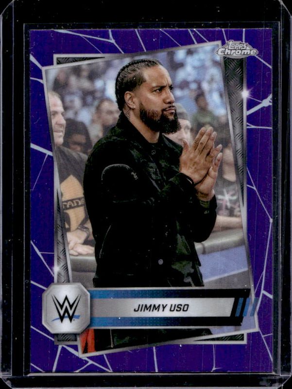 The Jimmy Uso 2025 Topps Chrome WWE #56 Purple Refractor card is 1 of 73 Jimmy Uso's card variations in the 2025 Topps Chrome WWE set being tracked by Sports Card Investor, including Base, Black & Gold Refractor, Geometric Refractor, Neon Green & Black Refractor, and Pink Shimmer Refractor.