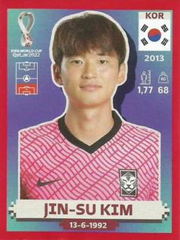 The Jin-su Kim 2022 Panini World Cup Stickers #KOR9 Red (1:26) card is 1 of 7 Jin-su Kim's card variations in the 2022 Panini World Cup Stickers set being tracked by Sports Card Investor, including Base, Blue (1:2), Gold, Green (1:1,445), and Purple (1:205).