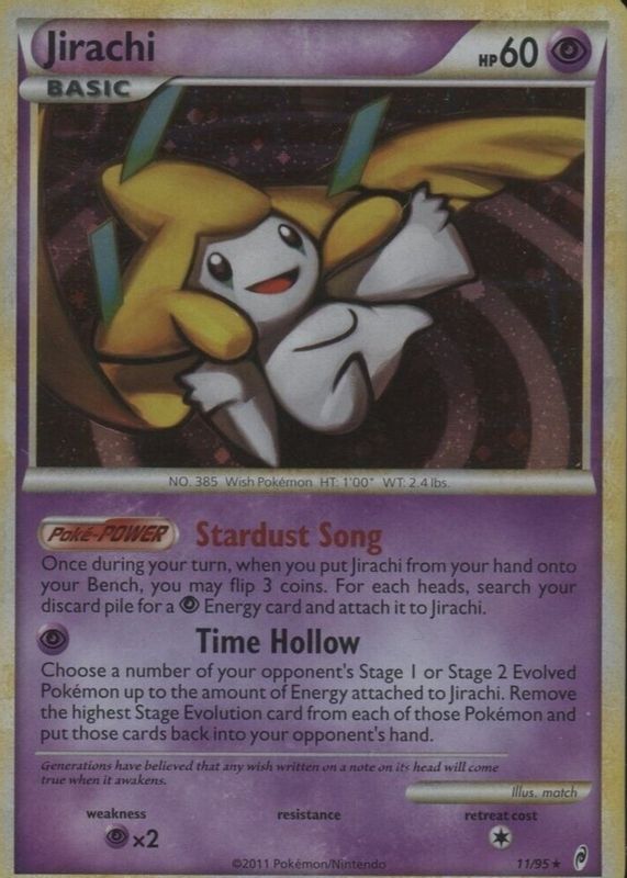 The Jirachi 2011 Call of Legends #11/95 Holo card in Raw TCG (Near Mint) condition has moved down -$8.99 (-31.0%) in the last 30 days and was last sold for $20.00 .