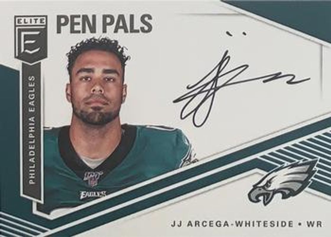 The JJ Arcega-Whiteside 2019 Elite #PP-JJ Pen Pals Rookie card is 1 of 26 JJ Arcega-Whiteside's card variations in the 2019 Elite set being tracked by Sports Card Investor, including Green, Red /299, Purple /99, Orange /49, and Aspirations Die-Cut /24.
