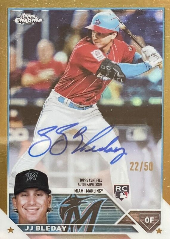 The JJ Bleday 2023 Topps Chrome #RA-JJB Rookie Autographs - Gold Refractor /50 card in Raw condition has not changed in price in the last 30 days and was last sold for $25.00 .