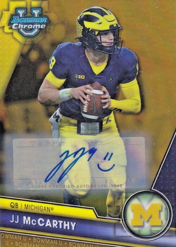 This card is 1 of 26 JJ McCarthy's card variations in the 2023 Bowman Chrome University set being tracked by Sports Card Investor, including Prospects - SP Variation, Prospect Auto, Prospect Auto - Refractor /499, Prospect Auto - Fuchsia Mini-Diamond Refractor /150, and The Big Kahuna Autographs /150.