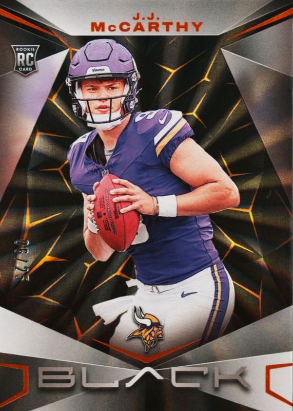 This card is 1 of 19 JJ McCarthy's card variations in the 2024 Black set being tracked by Sports Card Investor, including Base, Royal /99, Sapphire /35, Emerald /15, and Gold /10.