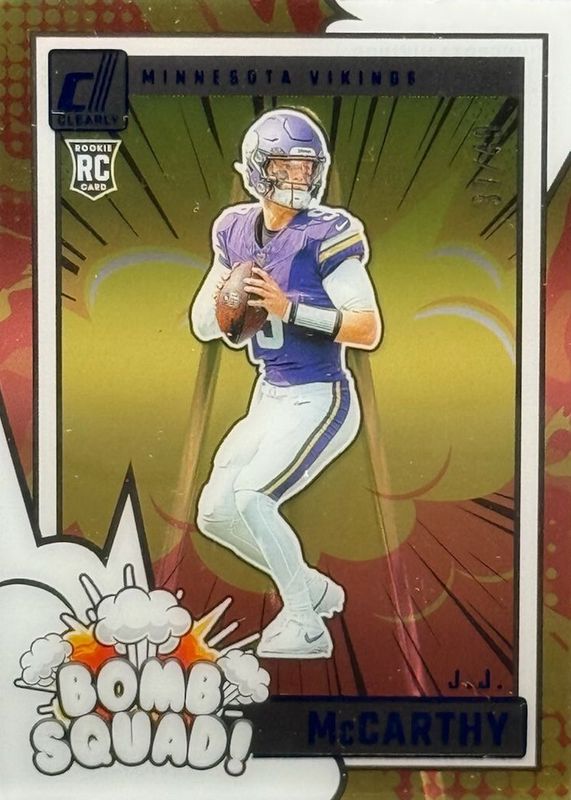 The JJ McCarthy 2024 Clearly Donruss #5 Clearly Bomb Squad - Blue /49 Rookie card in Raw condition has not changed in price in the last 30 days and was last sold for $72.00 .