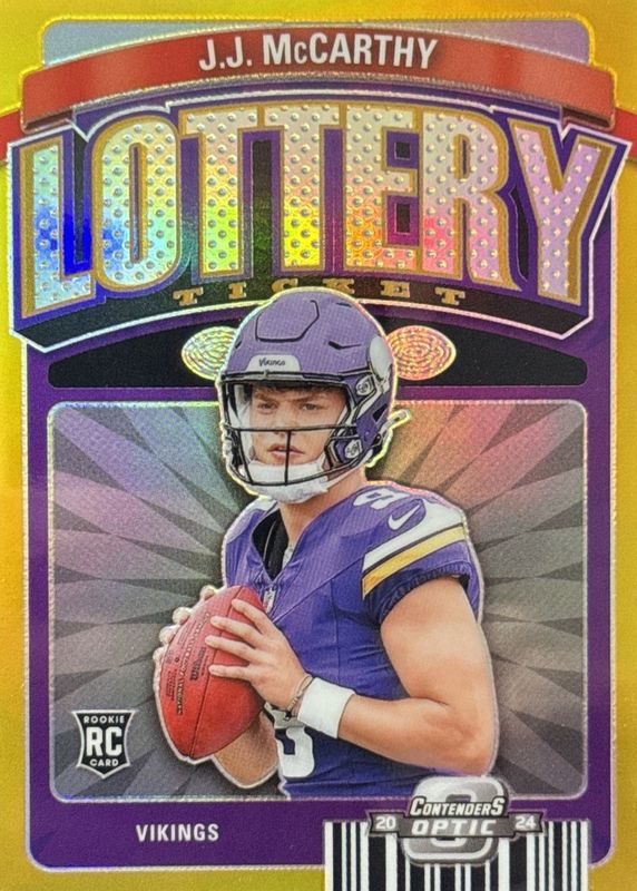 The JJ McCarthy 2024 Contenders Optic #LT-JJM Lottery Ticket - Gold /10 Rookie card in Raw condition has not changed in price in the last 30 days and was last sold for $405.00 .