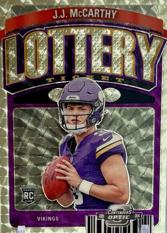 The JJ McCarthy 2024 Contenders Optic #LT-JJM Lottery Ticket - Gold Vinyl /1 Rookie card in Raw condition has not changed in price in the last 30 days and was last sold for $2,500.00 .