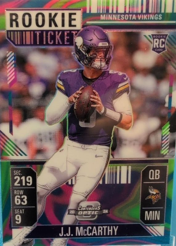 Auctions Ending Soon for JJ McCarthy 2024 Contenders Optic #71 Neon Marble /4 Rookie RAW