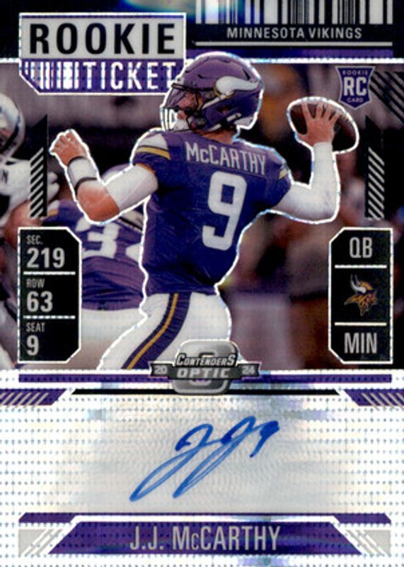 Auctions Ending Soon for JJ McCarthy 2024 Contenders Optic #101 Rookie Ticket Auto - Black Pulsar /8 RAW