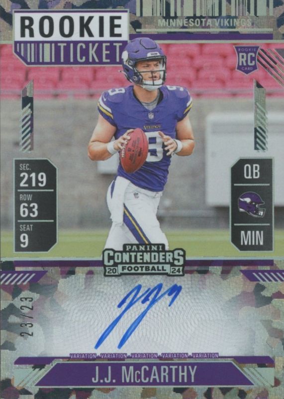This card is 1 of 28 JJ McCarthy's card variations in the 2024 Contenders set being tracked by Sports Card Investor, including Rookie Ticket Auto, Rookie Ticket Auto - Opening Kickoff Ticket, Rookie Ticket Auto - Red Zone Ticket, Rookie Ticket Auto - Ticket Stub (/9), and Rookie Ticket Auto Variation.