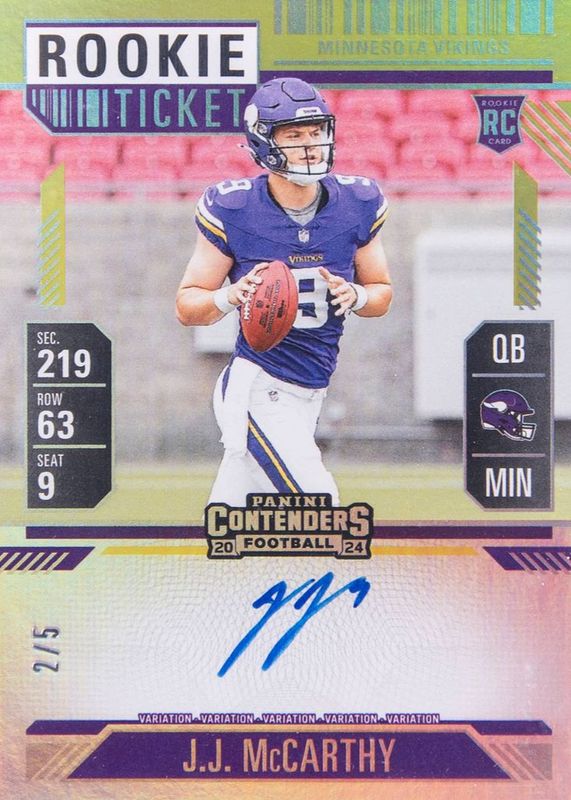 This card is 1 of 28 JJ McCarthy's card variations in the 2024 Contenders set being tracked by Sports Card Investor, including Rookie Ticket Auto, Rookie Ticket Auto - Opening Kickoff Ticket, Rookie Ticket Auto - Red Zone Ticket, Rookie Ticket Auto - Ticket Stub (/9), and Rookie Ticket Auto Variation.