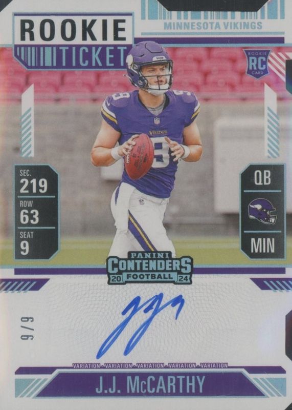 This card is 1 of 28 JJ McCarthy's card variations in the 2024 Contenders set being tracked by Sports Card Investor, including Rookie Ticket Auto, Rookie Ticket Auto - Opening Kickoff Ticket, Rookie Ticket Auto - Red Zone Ticket, Rookie Ticket Auto - Ticket Stub (/9), and Rookie Ticket Auto Variation.