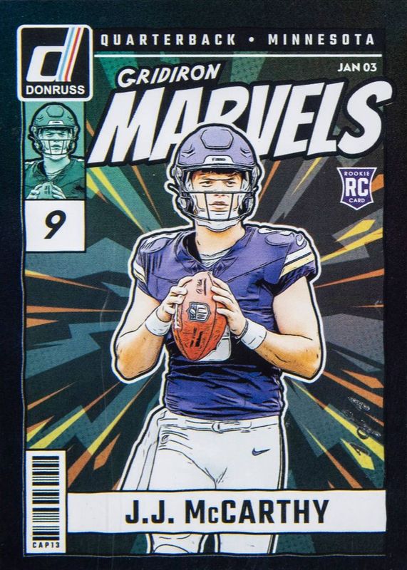 JJ McCarthy 2024 Donruss #20 Gridiron Marvels - Black /1 Rookie RAW Price Guide
