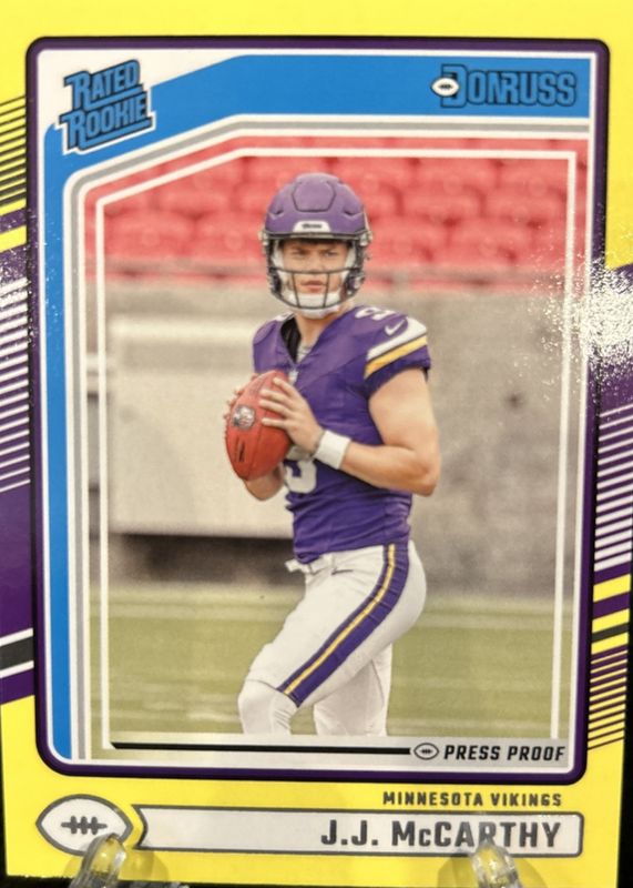 The JJ McCarthy 2024 Donruss #303 Press Proof Yellow Rookie card in Raw condition has moved up $2.00 (+39.9%) in the last 30 days and was last sold for $7.00 .