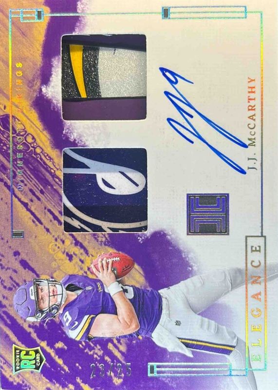 The JJ McCarthy 2024 Impeccable #RHP-JMY Elegance Rookie Autographs - Helmet & Glove /25 card in Raw condition has not changed in price in the last 30 days and was last sold for $393.00 .