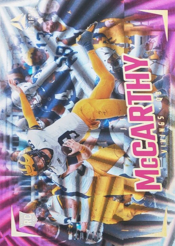 This card is 1 of 26 JJ McCarthy's card variations in the 2024 Luminance set being tracked by Sports Card Investor, including Horizontal Rookies, Vertical Rookies, Horizontal Rookies - Gold /299, Vertical Rookies - Gold /299, and Horizontal Rookies - Purple /175.