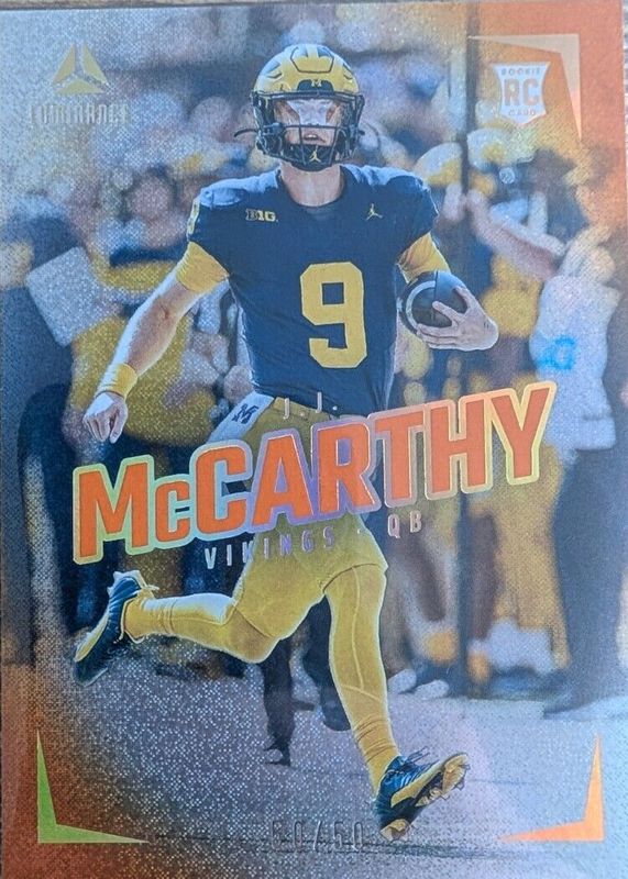 This card is 1 of 26 JJ McCarthy's card variations in the 2024 Luminance set being tracked by Sports Card Investor, including Horizontal Rookies, Vertical Rookies, Horizontal Rookies - Gold /299, Vertical Rookies - Gold /299, and Horizontal Rookies - Purple /175.
