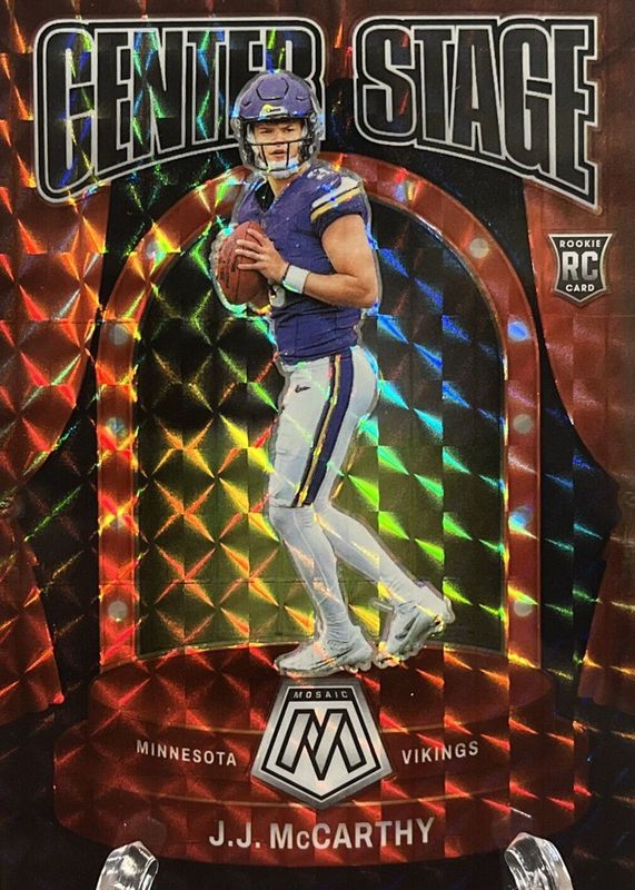 The JJ McCarthy 2024 Mosaic #9 Center Stage - Black /1 Rookie card in Raw condition has not changed in price in the last 30 days and was last sold for $565.00 .