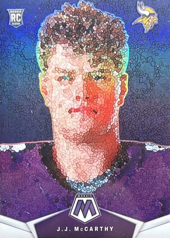 The JJ McCarthy 2024 Mosaic #9 Micro Mosaic /(SSP) Rookie card in Raw condition has moved up $26.37 (+25.4%) in the last 30 days and was last sold for $130.00 .