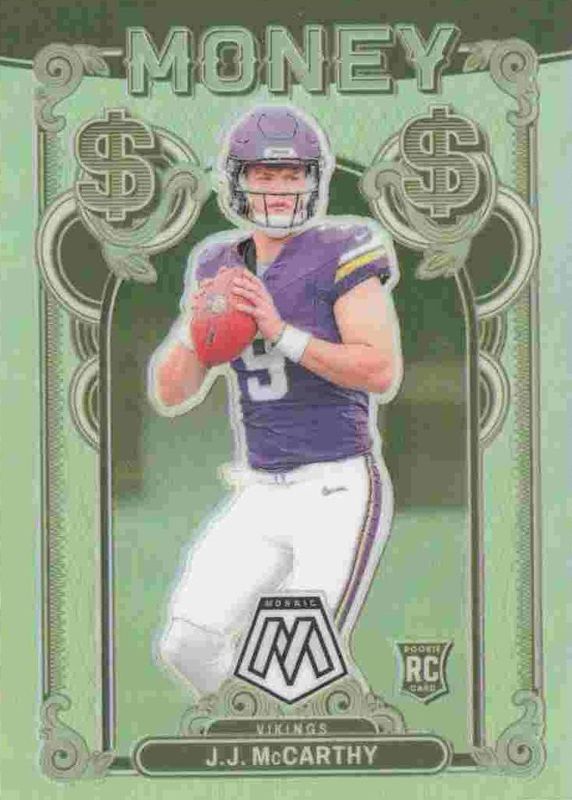 The JJ McCarthy 2024 Mosaic #1 Money /(SSP) Rookie card in Raw condition has moved up $19.57 (+41.6%) in the last 30 days and was last sold for $66.57 .
