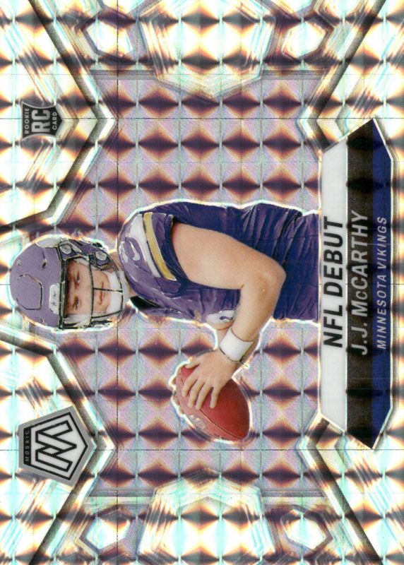 The JJ McCarthy 2024 Mosaic #275 NFL Debut - Mosaic Rookie card in Raw condition has moved up $0.75 (+33.3%) in the last 30 days and was last sold for $3.00 .