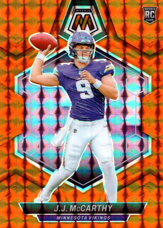 The JJ McCarthy 2024 Mosaic #310 Orange /199 Rookie card in Raw condition has moved up $25.00 (+71.4%) in the last 30 days and was last sold for $59.99 .