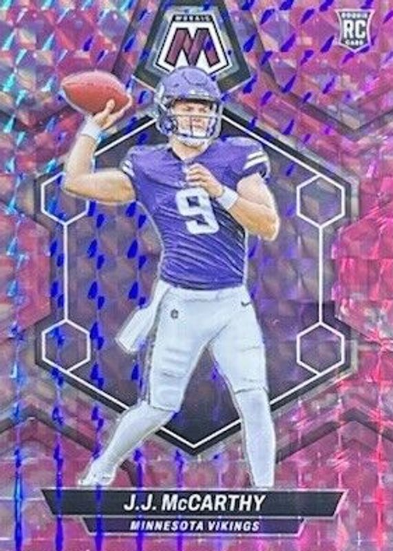 The JJ McCarthy 2024 Mosaic #310 Pink Camo Rookie card in Raw condition has moved down -$0.59 (-20.8%) in the last 30 days and was last sold for $2.25 .