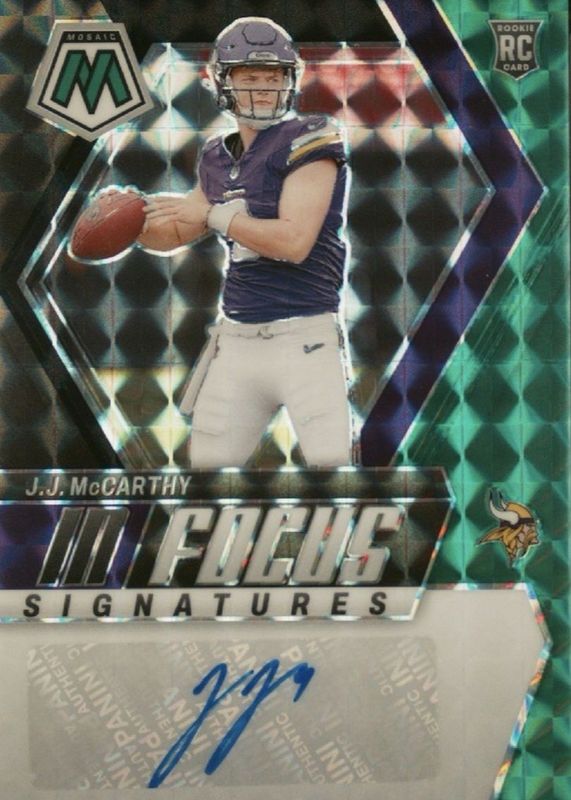 Best Prices Available For Sale of JJ McCarthy 2024 Mosaic #310 Rookie Autographs - Choice Fusion Green & Black /25