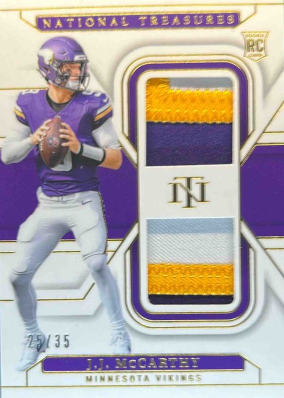 J.J. MCCARTHY 2024 NATIONAL TREASURES ROOKIE DUAL PATCH GOLD RC /35 Q5718