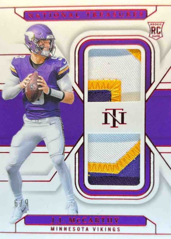 The JJ McCarthy 2024 National Treasures #RDM-JMY Rookie Dual Materials - Red Jersey Number (/9) card in Raw condition has not changed in price in the last 30 days and was last sold for $152.50 .