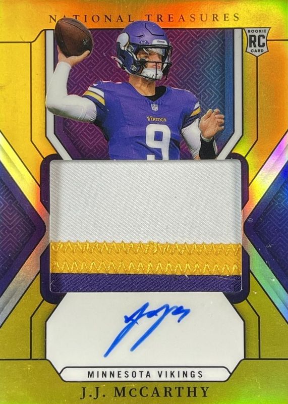 Auctions Ending Soon for JJ McCarthy 2024 National Treasures #156 Rookie Patch Auto - Premium Gold /10 RAW