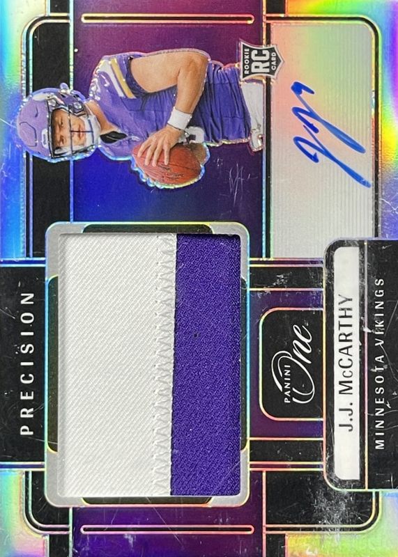 The JJ McCarthy 2024 One #301 Precision Rookie Patch Autographs /99 card in Raw condition has moved down -$47.49 (-23.7%) in the last 30 days and was last sold for $152.50 .