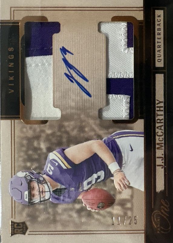 2024 Panini One J.J. McCarthy RC Dual Patch Auto Bronze 21/25 Vikings