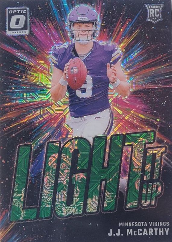 The JJ McCarthy 2024 Optic #2 Light It Up - Dragon /24 Rookie card in Raw condition has not changed in price in the last 30 days and was last sold for $84.00 .
