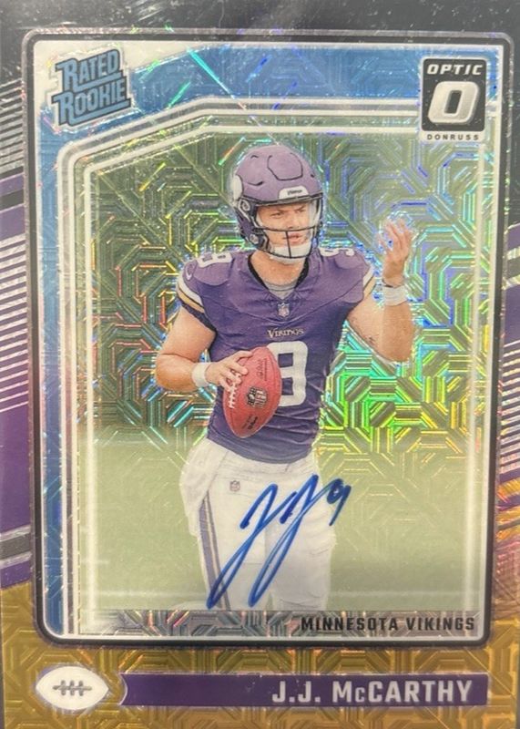 2024-25 J.J. McCarthy Optic Rated Rookie Black Gold RC Auto #9/60 Jersey Match