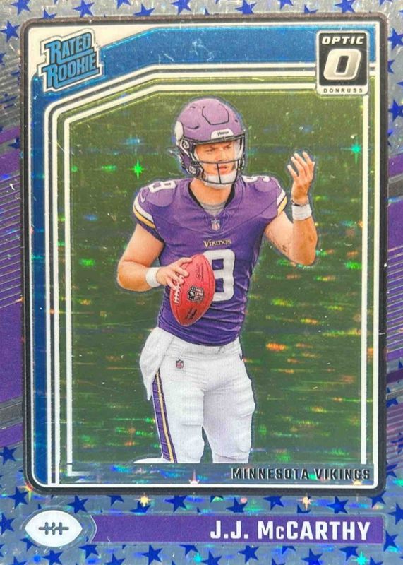 The JJ McCarthy 2024 Optic #235 Stars /(SSP) Rookie card in Raw condition has moved up $8.00 (+100%) in the last 30 days and was last sold for $16.00 .