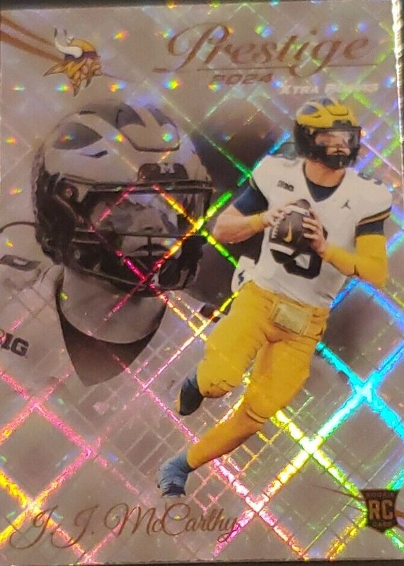 This card is 1 of 31 JJ McCarthy's card variations in the 2024 Prestige set being tracked by Sports Card Investor, including Base, Dots Xtra Points, Galaxy Xtra Points, Hyper Xtra Points, and Sunburst Xtra Points.