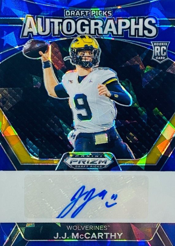 The JJ McCarthy 2024 Prizm Draft Picks #DPA-JMY Draft Picks Autographs - Blue Ice /75 Rookie card in Raw condition has not changed in price in the last 30 days and was last sold for $139.99 .