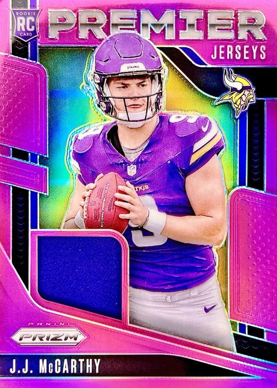 The JJ McCarthy 2024 Prizm #PJ-JJM Premier Jerseys - Pink Rookie card in Raw condition has not changed in price in the last 30 days and was last sold for $2.25 .