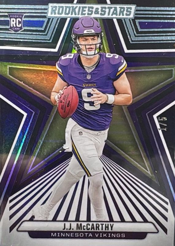 This card is 1 of 12 JJ McCarthy's card variations in the 2024 Rookies & Stars set being tracked by Sports Card Investor, including Base, Green, Longevity, Red, and Purple /299.