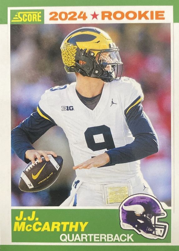 The JJ McCarthy 2024 Score #8 35th Anniversary Rookie - Orange card in Raw condition has not changed in price in the last 30 days and was last sold for $2.25 .