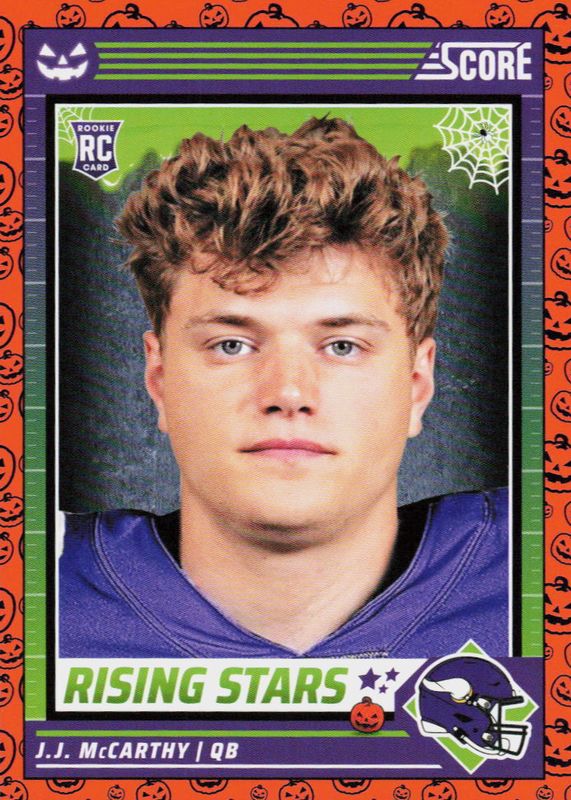 The JJ McCarthy 2024 Score-A-Treat #19 Rising Stars - Orange Pumpkins Rookie card in Raw condition has moved up $0.70 (+70.0%) in the last 30 days and was last sold for $1.70 .