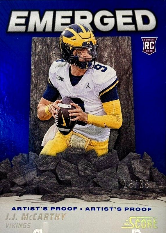 The JJ McCarthy 2024 Score #EM-JMY Emerged - Artist's Proof /35 Rookie card in Raw condition has not changed in price in the last 30 days and was last sold for $11.50 .