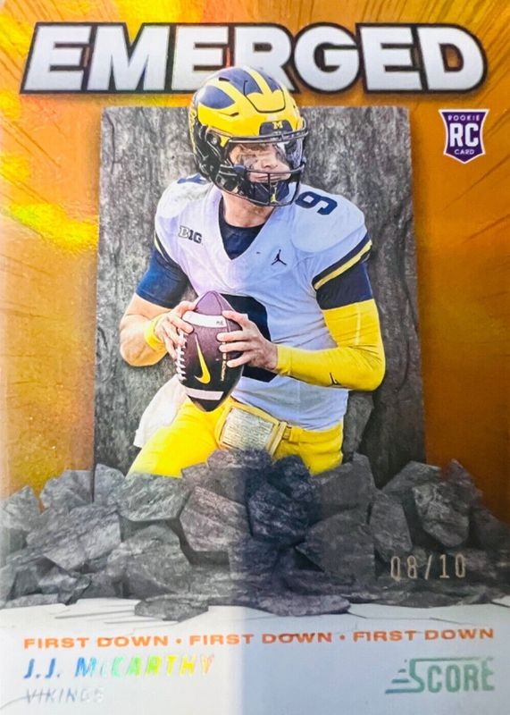 The JJ McCarthy 2024 Score #EM-JMY Emerged - First Down /10 Rookie card in Raw condition has not changed in price in the last 30 days and was last sold for $75.00 .