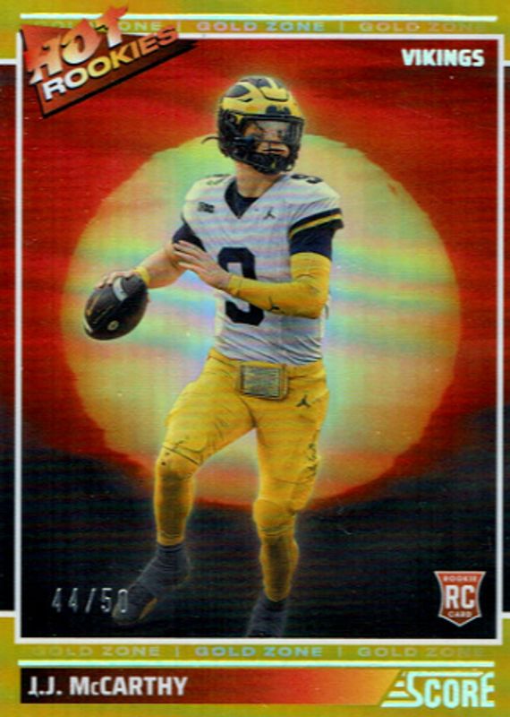 The JJ McCarthy 2024 Score #11 Hot Rookies - Gold Zone /50 card in Raw condition has not changed in price in the last 30 days and was last sold for $20.95 .