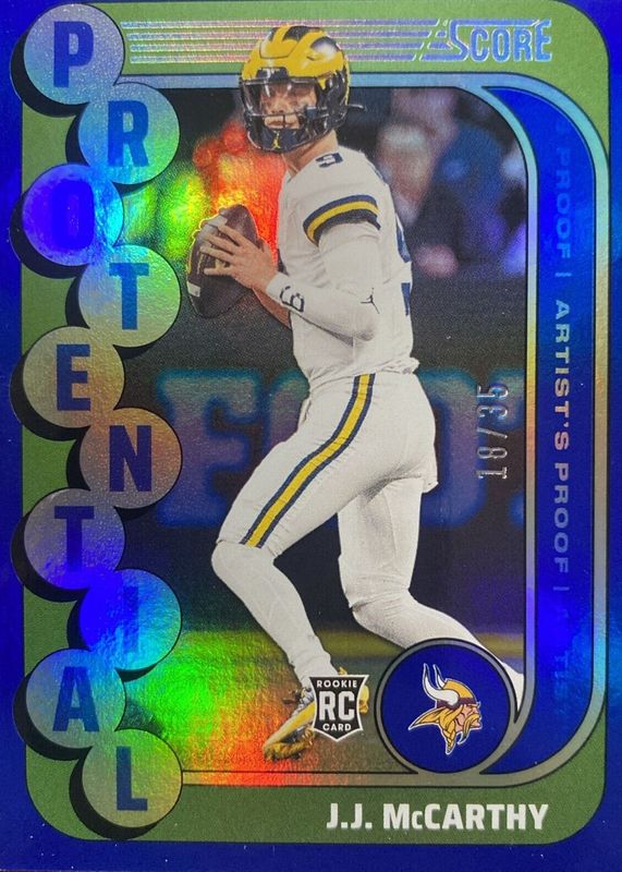The JJ McCarthy 2024 Score #10 Protential - Artist's Proof /35 Rookie card in Raw condition has not changed in price in the last 30 days and was last sold for $20.77 .