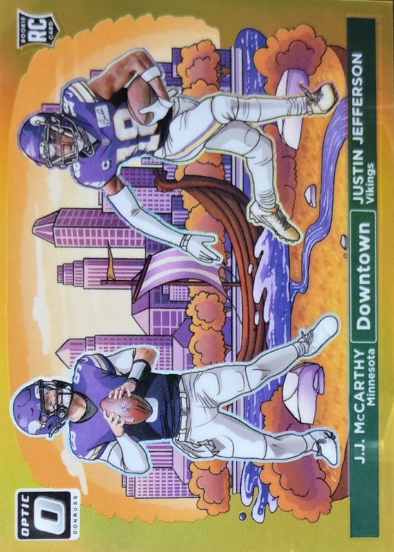 This card is 1 of 5 JJ McCarthy / Justin Jefferson's card variations in the 2024 Optic set being tracked by Sports Card Investor, including Downtown Duos /(SSP), Downtown Duos - Black Pandora /25, Downtown Duos - Gold Vinyl /1, and Downtown Duos - White Sparkle /1.