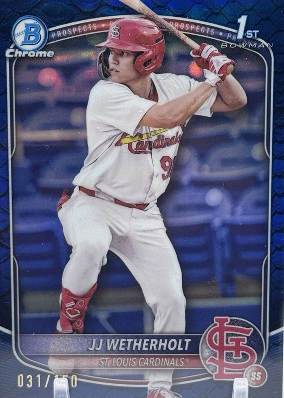 The JJ Wetherholt 2025 Bowman #BCP-22 Chrome Prospects - Reptilian Blue Refractor /150 (1st) card in Raw condition has not changed in price in the last 30 days and was last sold for $75.00 .