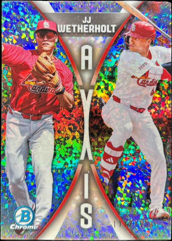 The JJ Wetherholt 2025 Bowman Draft #A-12 Axis - Mini-Diamond Refractor /150 card is 1 of 95 JJ Wetherholt's card variations in the 2025 Bowman Draft set being tracked by Sports Card Investor, including Base, Chrome, Chrome - Lazer Refractor, Chrome - Refractor, and Chrome - Sky Blue Refractor.