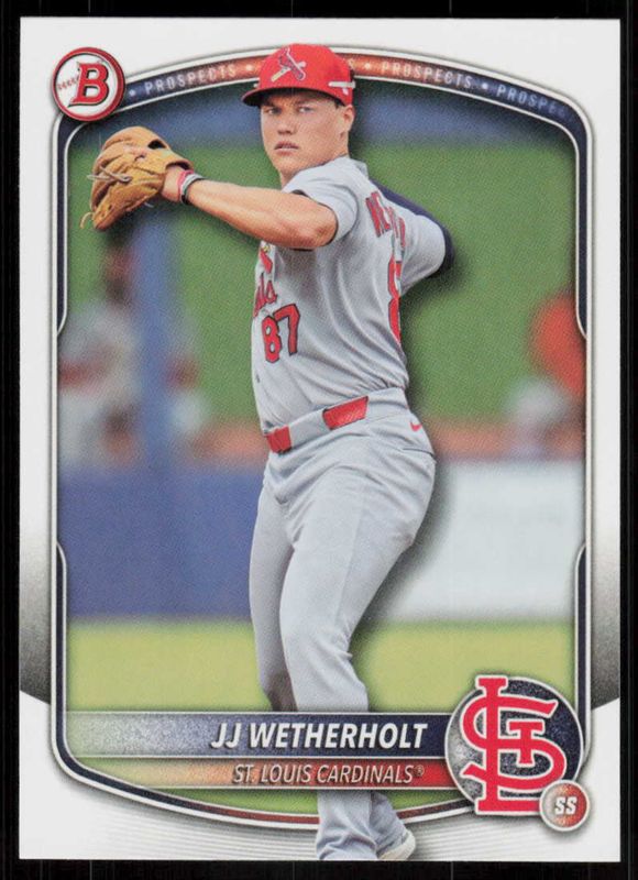 The JJ Wetherholt 2025 Bowman Draft #BD-145 Base card is 1 of 95 JJ Wetherholt's card variations in the 2025 Bowman Draft set being tracked by Sports Card Investor, including Chrome, Chrome - Lazer Refractor, Chrome - Refractor, Chrome - Sky Blue Refractor, and Chrome - X-Fractor.